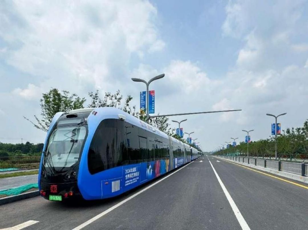 4月29日,由蜀道集團所屬蜀道新制式軌道公司投資、建設、運營,中車株洲電力機車研究所有限公司自主研制的新一代智軌列車,亮相成都世界園藝博覽會(簡稱“世園會”),為前來參觀世園會的人民群眾免費提供“綠色、低碳、環?!笔走x出行方式,同時,向世界展示新制式軌道交通“中國造”“四川造”。