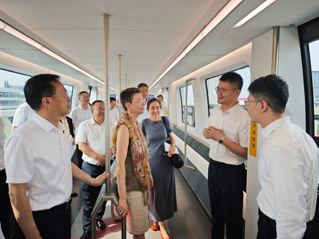8月8日上午,德國駐華大使傅融博士一行蒞臨磁浮綜合試驗基地參觀考察,并試乘體驗公司三編組磁浮列車。蜀道集團總工程師黃兵,蜀道軌道交通集團黨委書記、董事長羅廷,新筑股份黨委書記、董事長肖光輝,磁浮公司黨總支書記、董事長唐林,黨總支副書記、總經理姜雪嬌陪同參觀考察。